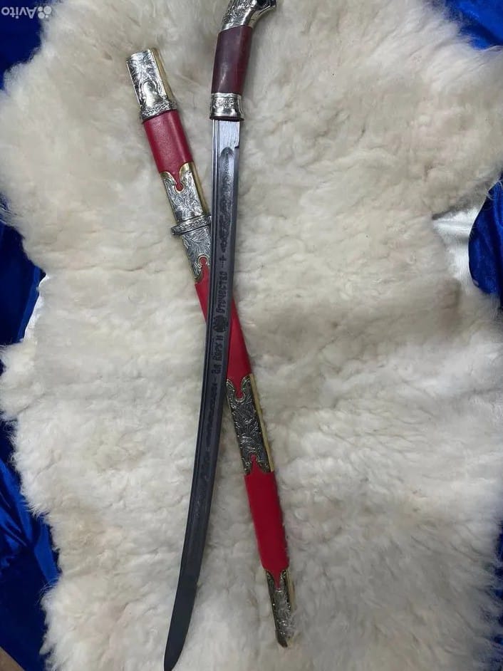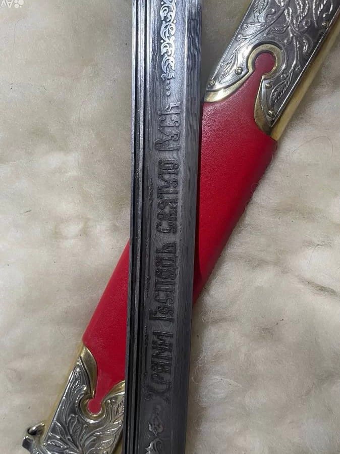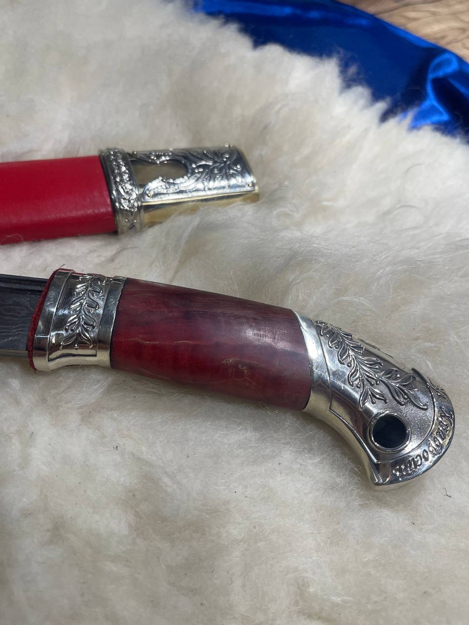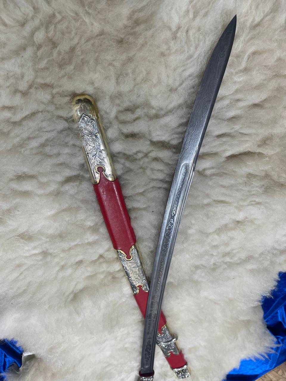 шашка казачья сталь дамаск приборы мельхиор на латуни ручка стабилизированная корельская берёза кожа красная