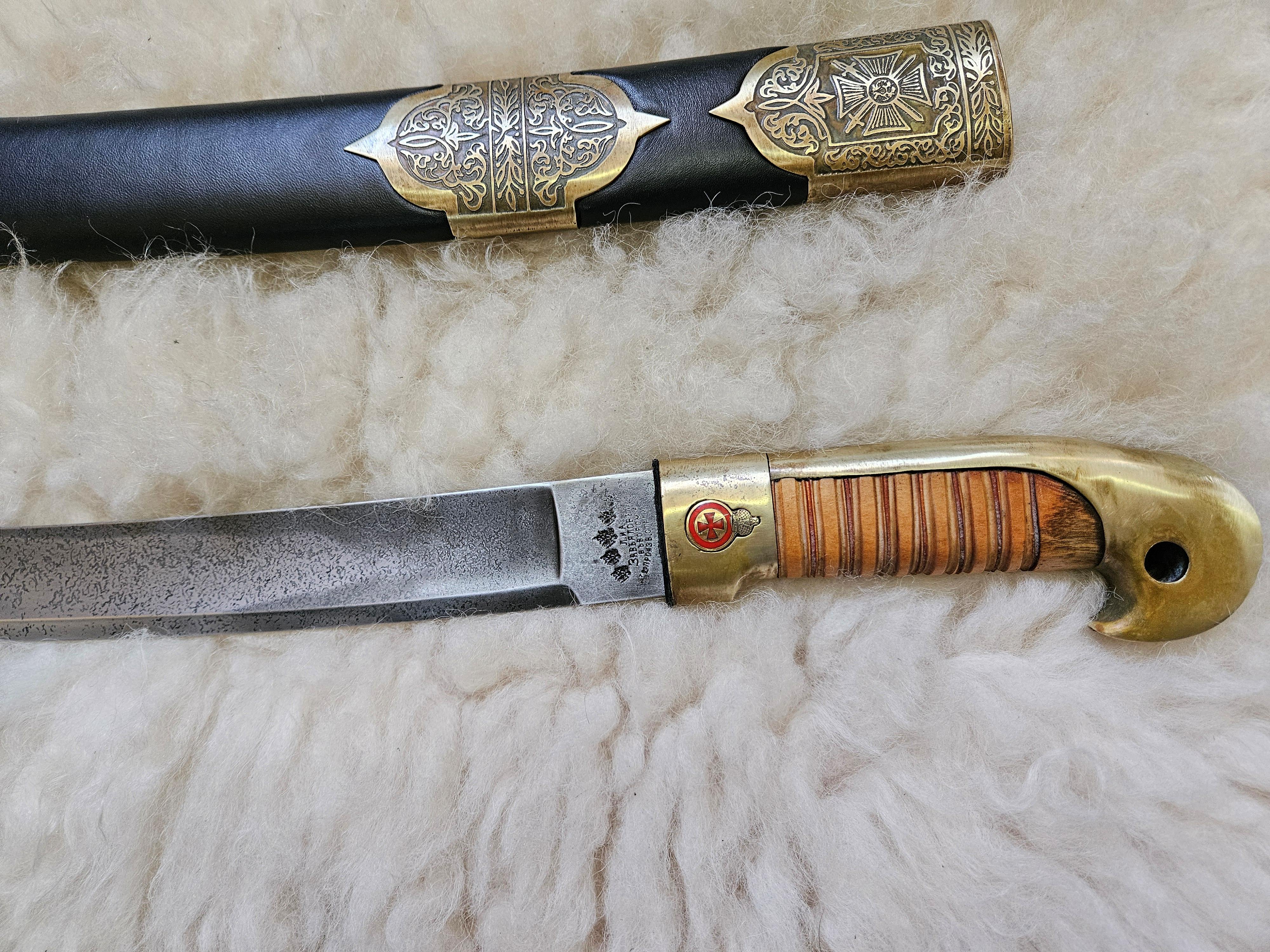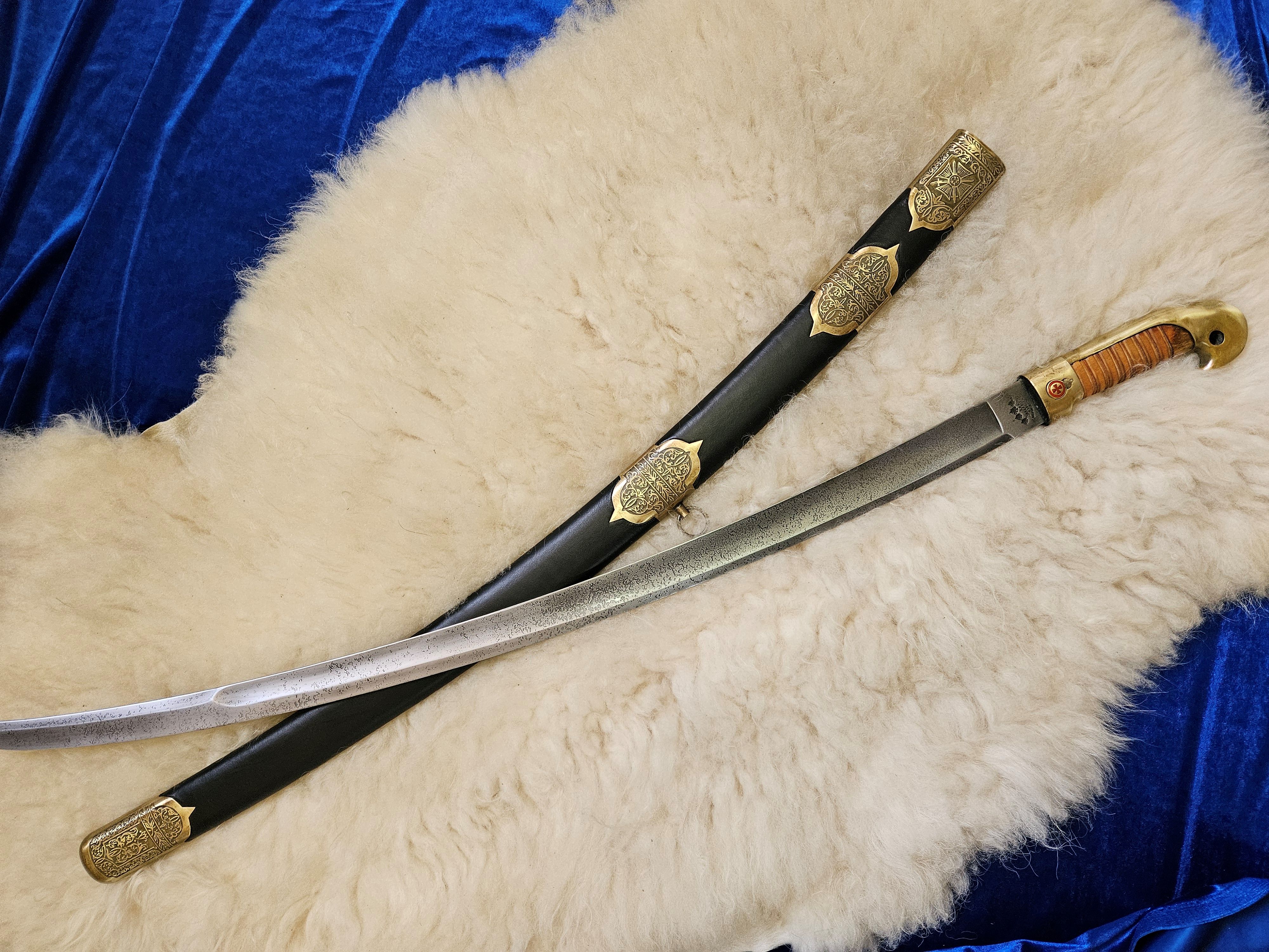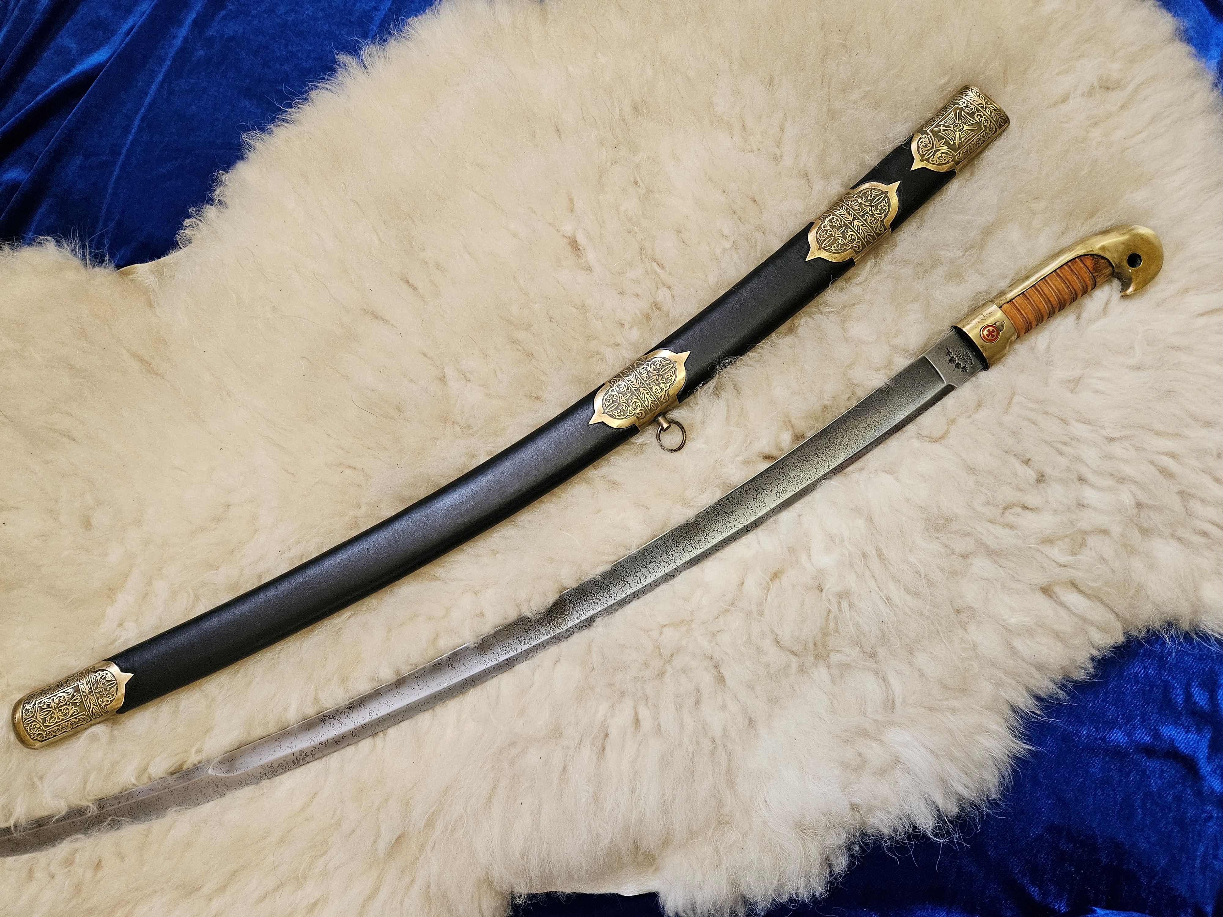 шашка баклановская встала на вооружение в 1838г представляем Вам один из вариантов реплик её изготовления ,клинок класический образец тех времён ,клинок чистый без гравировки с клеймом ЛиА Завъяловых ,приборы и литьё латунь ,на колпаках путём травления нанесены узоры ,на верхнем колпаке баклановский знак,т также в ручку закреплён знак ордена Святой Анны, изделие по внешнему виду максимально схоже с экзэмплярами естевственно состарившиеся со времён царизма