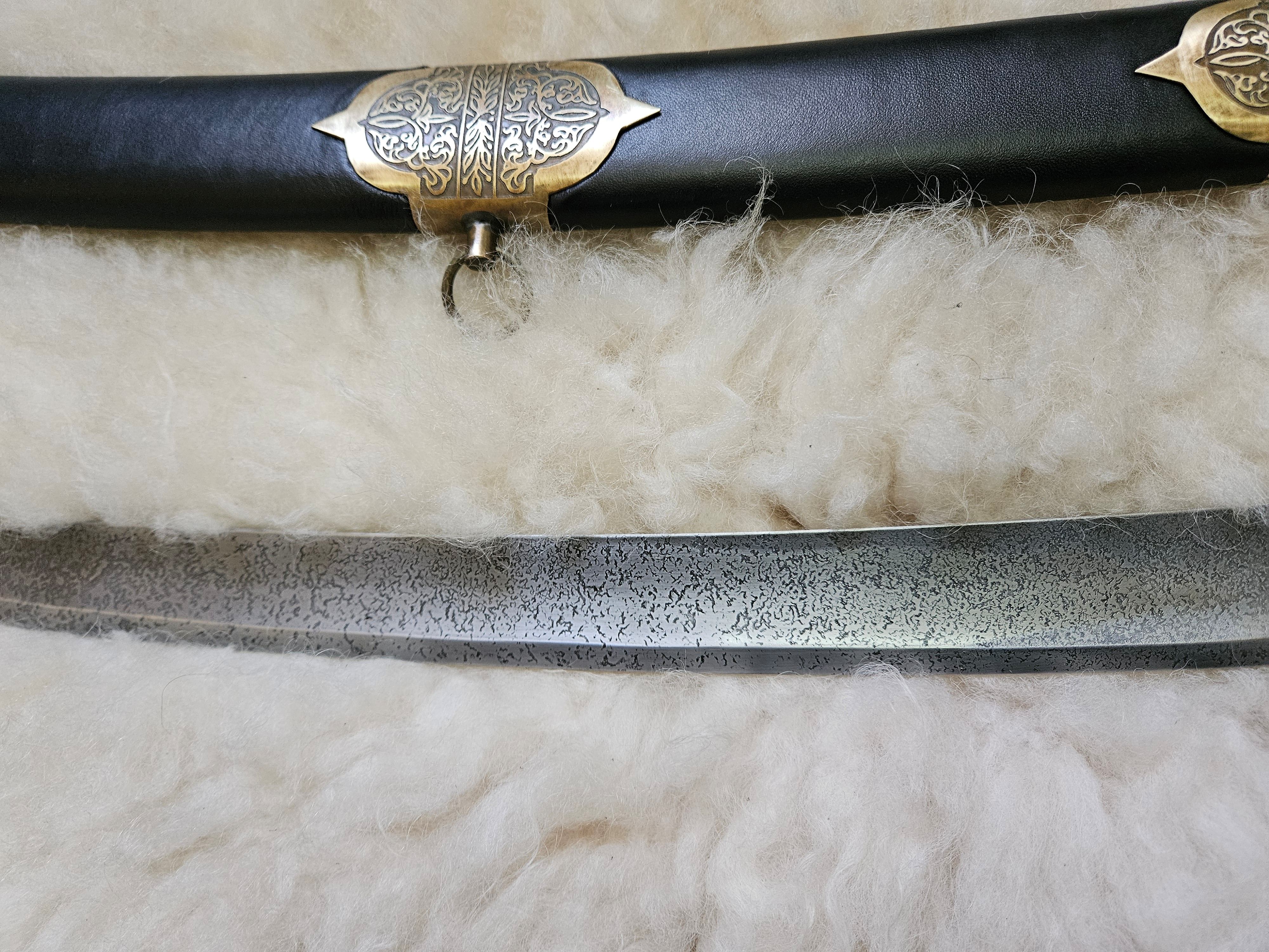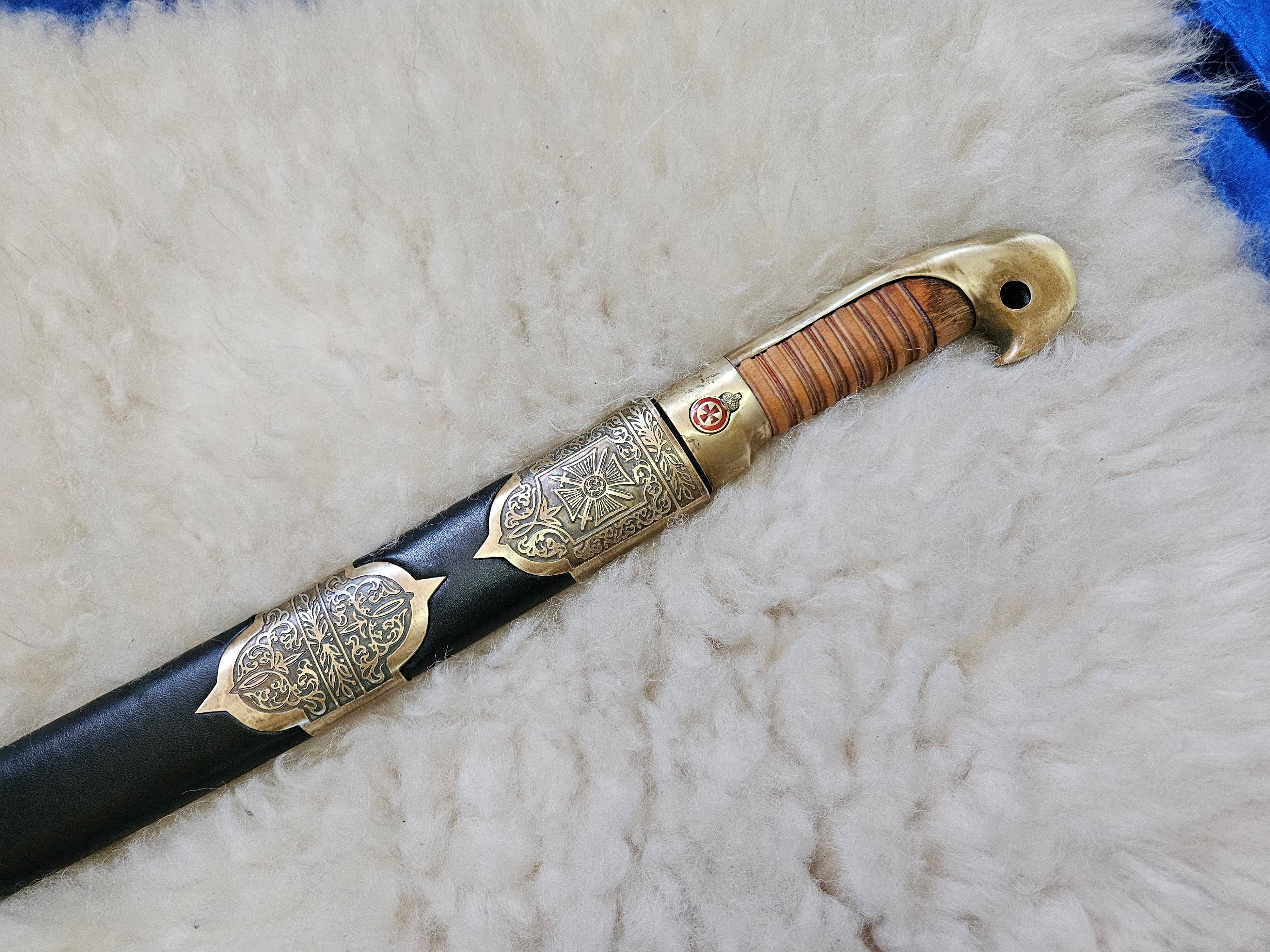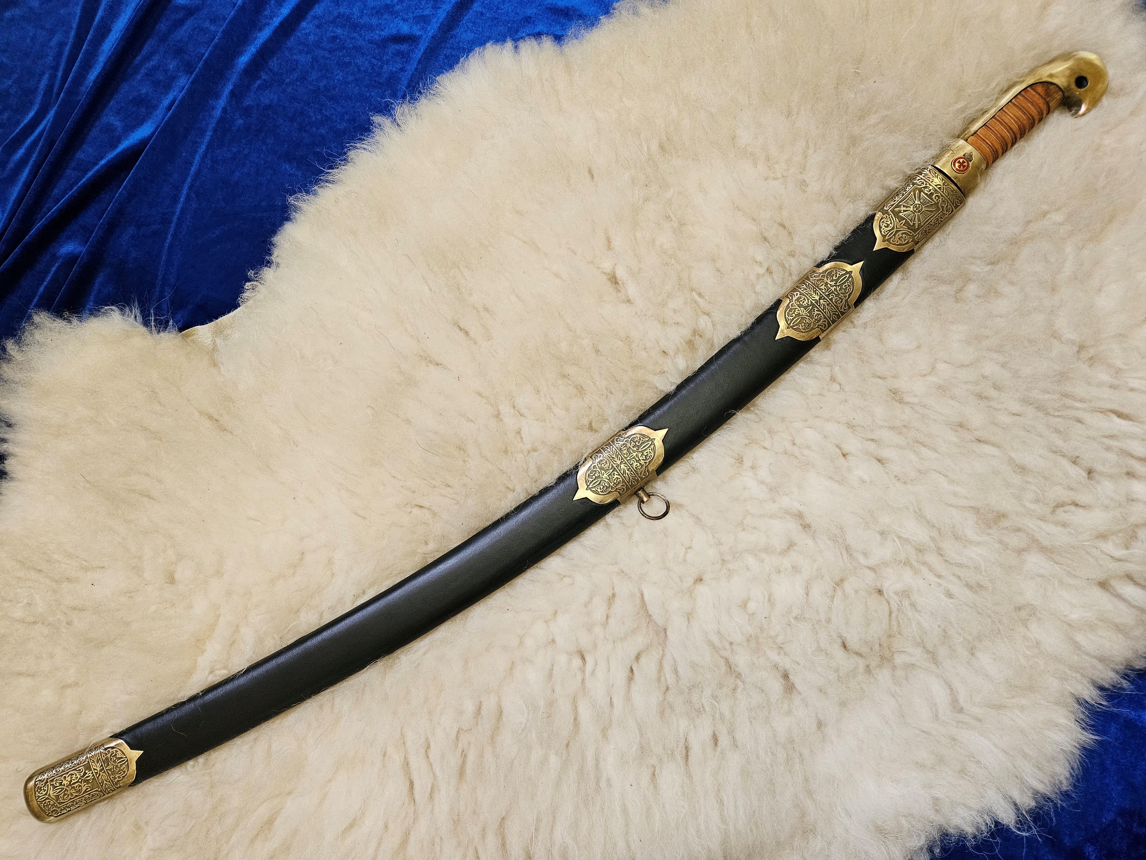 шашка баклановская встала на вооружение в 1838г представляем Вам один из вариантов реплик её изготовления ,клинок класический образец тех времён ,клинок чистый без гравировки с клеймом ЛиА Завъяловых ,приборы и литьё латунь ,на колпаках путём травления нанесены узоры ,на верхнем колпаке баклановский знак,т также в ручку закреплён знак ордена Святой Анны, изделие по внешнему виду максимально схоже с экзэмплярами естевственно состарившиеся со времён царизма