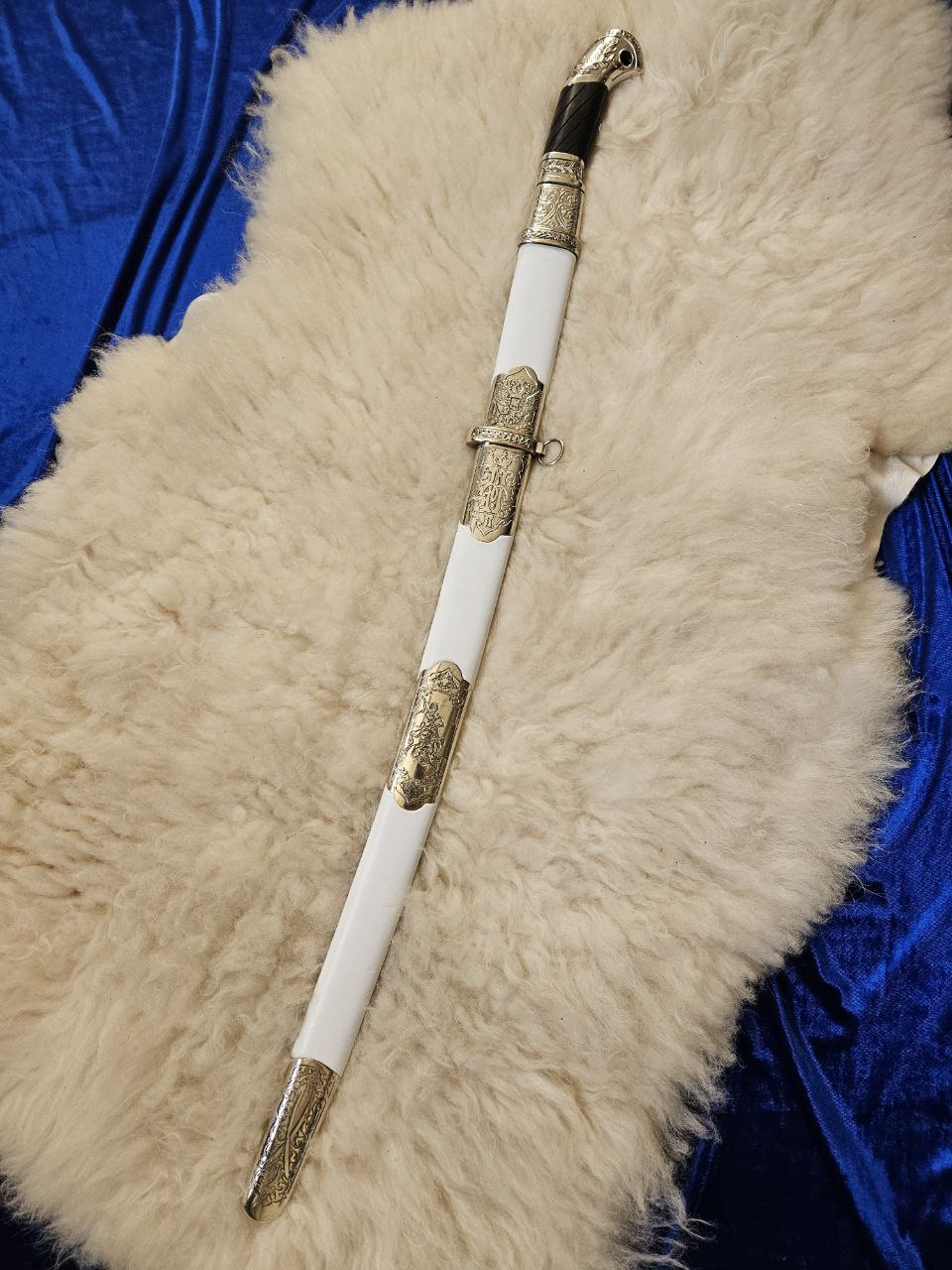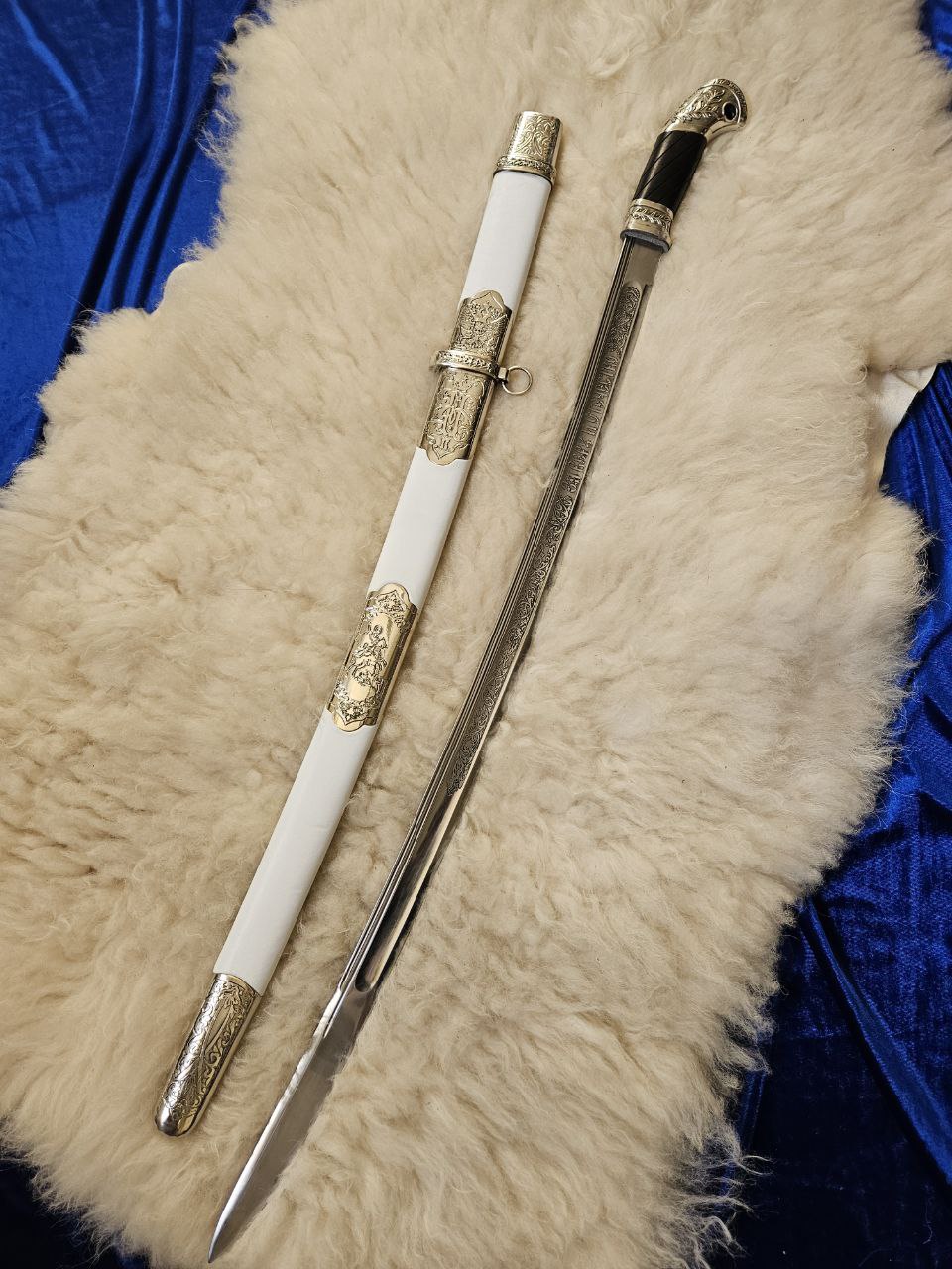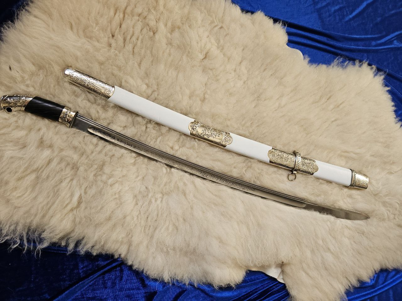 шашка казачья офицерская (За храбрость) клинок трёхдолый обр.1881 года, ножны дерево ,белая кожа,приборы и литьё незельбер, ручка из берёзы окрашена вскрыта воском ,на клинке с одной стороны надпись (За Веру и Отечество) оформлено вензелями,c другой (без нужды не вынимай без славы не вкладывай) также в вензелях , на приборах ножны изображены -двуглавый орёл ,вензель Николая 2, Георгий Победоносец